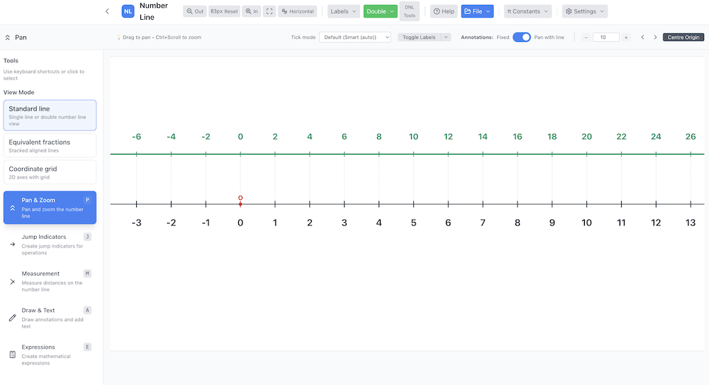 A number line app where the line can be scrolled perpetually in both positive and negative directions. Single and double number lines and various tools to support using it for teaching. This is in beta and is not fully finished. There are bugs and missing features.