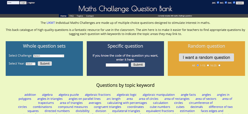 This is one of my hand coded apps from several years ago. It organises and displays past questions from the UKMT maths challenges.